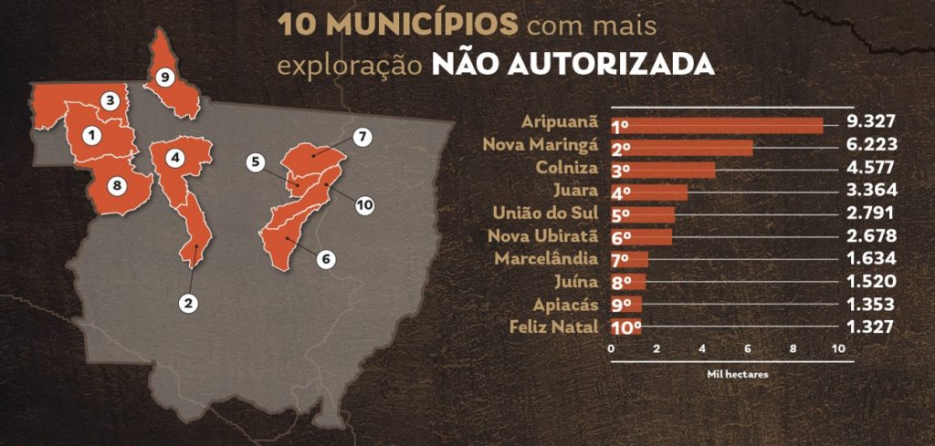 Em relação à exploração ilegal, 48 mil hectares de área, ao todo, foram registradas, o que representa uma redução de 40% quando comparado ao período anterior. Conforme o mapeamento, a prática foi identificada em 230 imóveis, sendo que apenas 20 deles representam 1/3 da ilegalidade nessa categoria. A maior parte dos municípios listados fica no bioma da Amazônia.