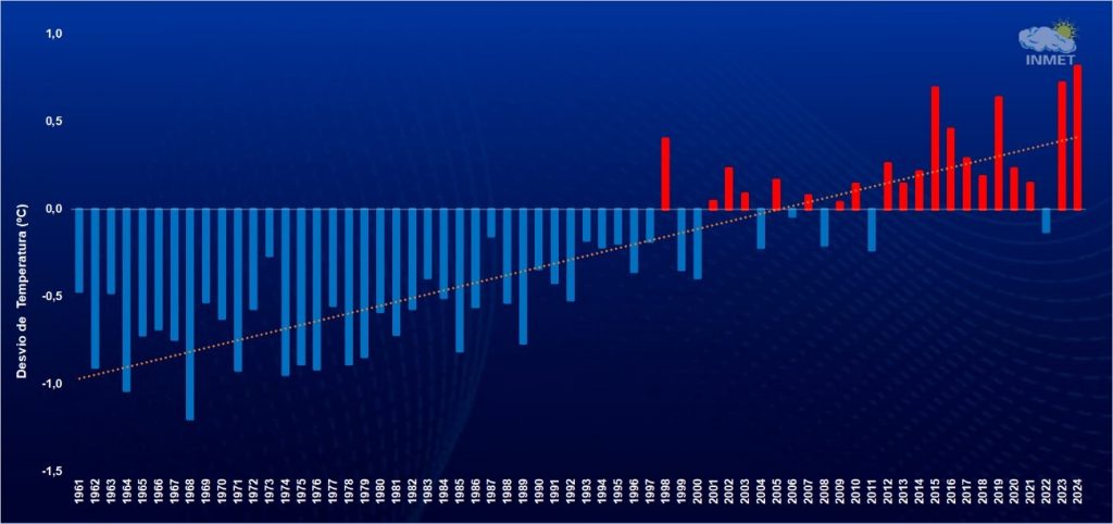 De acordo com o Inmet, quando observados os desvios que as temperaturas médias de cada ano desde 1961 apresentam em relação à média histórica entre 1991 e 2020, verifica-se que a tendência de aumento é estatisticamente significativa. “Pode estar associada à mudança no clima em decorrência da elevação da temperatura global e mudanças ambientais locais“, aponta o órgão.