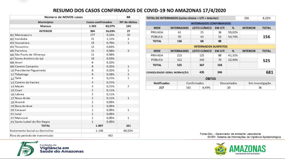 Além disso, 156 pacientes confirmados da doença encontram-se internados, sendo que 88 estão em UTI. Conforme a FVS-AM, 230 pessoas ainda estão aguardando resultado de exames.