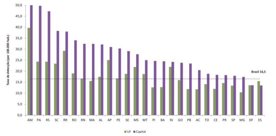 Manaus, capital do Amazonas, aparece no topo, com a taxa de detecção maior do que todo o Estado, de 64,6 casos a cada 100 mil habitantes, em 2021. O número é quase quatro vezes a taxa do Brasil, de 16,5 a cada 100 mil habitantes.