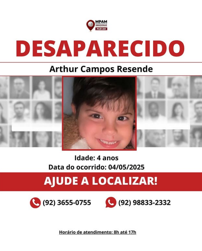 O desaparecimento de Arthur Campos Rezende foi informado pelo Ministério Público do Amazonas (MP-AM) nesta semana. Segundo o órgão, a criança está desaparecida desde o dia 4 de maio deste ano. A instituição não informou as circunstâncias do caso.