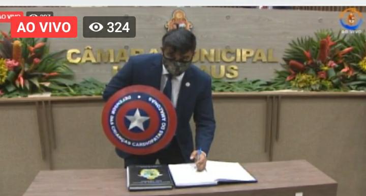 Os vereadores não discursaram, no entanto, uma nova cena inusitada, o vereador Dione Carvalho (Patriota) voltou a chamar atenção ao desfilar com um escudo de super-herói de quadrinhos, o Capitão América. Há cerca de duas semanas, o parlamentar viralizou nas redes sociais ao rastejar durante a diplomação para o cargo.
