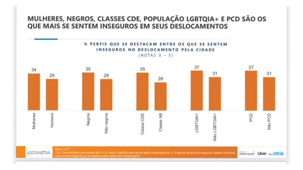 Segundo o estudo, as mulheres estão mais vulneráveis a sofrer violência durante o deslocamento. A pesquisa aponta que, nas considerações de 72% dos entrevistados, “os espaços públicos são mais perigosos para mulheres do que para homens”.