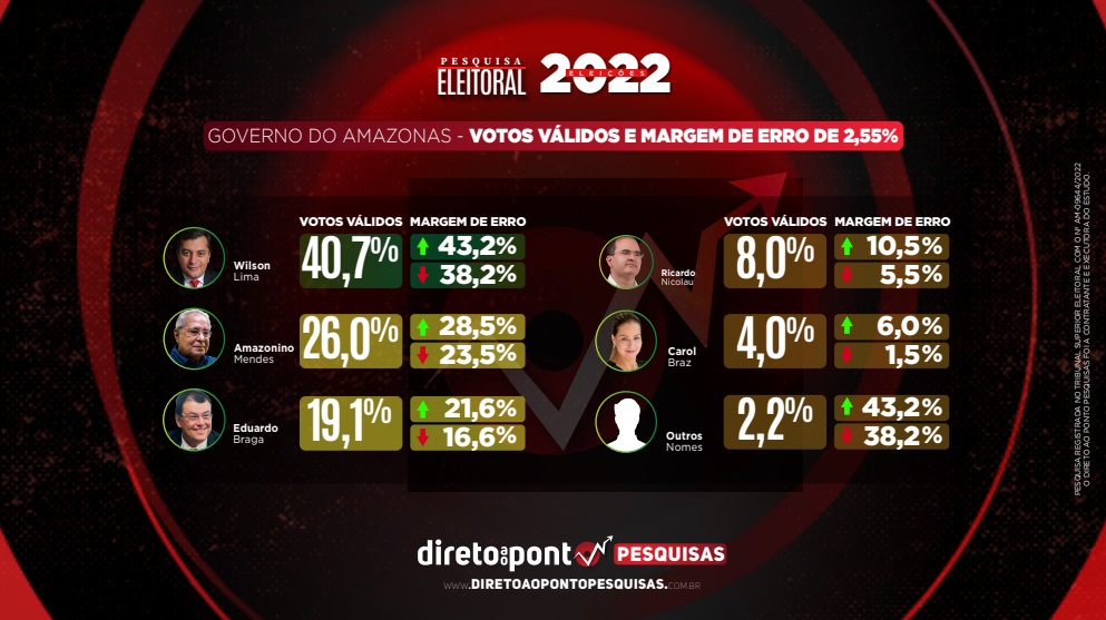 Já na pesquisa do Direto ao Ponto, registrada no TSE com o número AM-09644/2022, Wilson Lima tem 40,7% dos votos válidos, enquanto Amazonino Mendes tem 26% e Eduardo Braga tem 19,1%. O candidato Ricardo Nicolau surge com 8% das citações, seguido por Carol Braz com 4%. Os outros postulantes somam 2,2% da preferência do eleitorado.