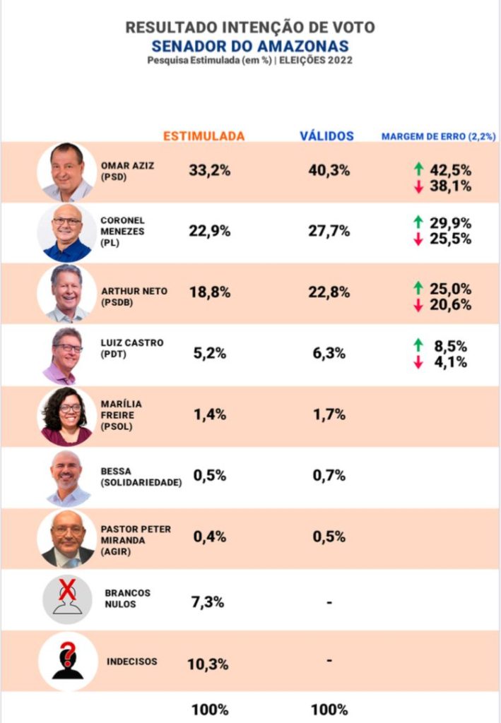 Para o cargo de senador do Amazonas no levantamento do Pontual Pesquisas, o candidato Omar Aziz (PSD) aparece em primeiro lugar, com 40,3% dos votos válidos, enquanto o Coronel Menezes (PL) tem 27,7% e o ex-prefeito de Manaus Arthur Neto (PSDB) tem 22,8% da preferência do eleitor.
