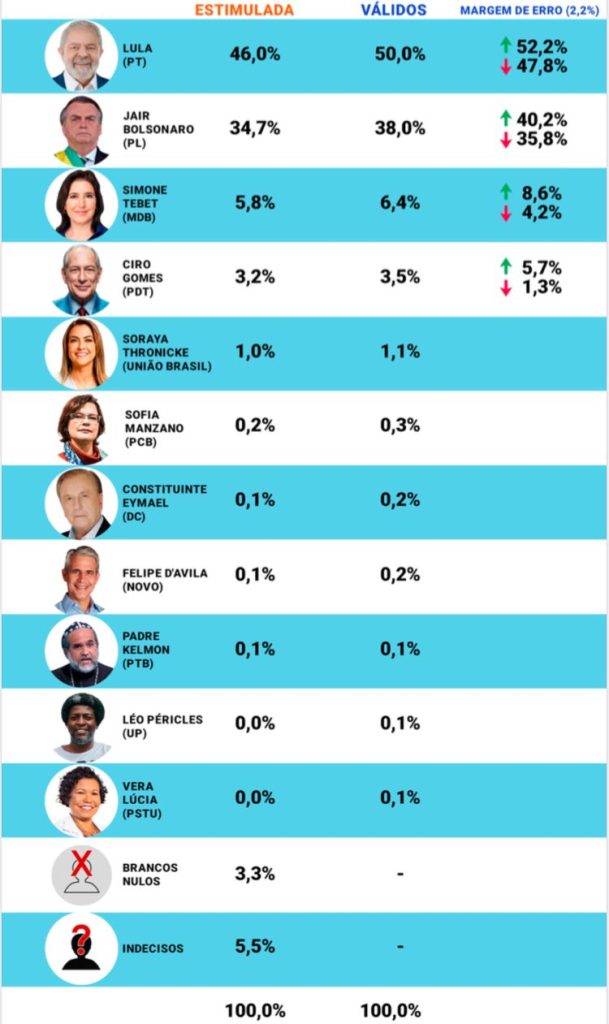 Na pesquisa estimulada, Lula continua na frente, com 46% das intenções de voto, enquanto Bolsonaro surge com 34,7%. Simone Tebet está em terceiro, com 5,8%, e o candidato Ciro Gomes tem 3,2%. Soraya Thronicke (União Brasil) tem 1%. Confira, na tabela, os demais candidatos: