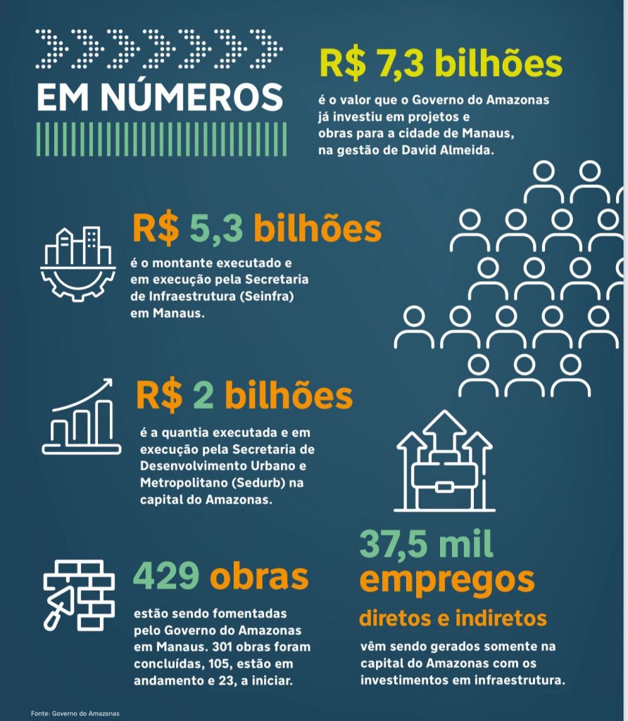 Entre as obras e projetos patrocinados pelo governo do Estado na capital estavam e estão o “Asfalta Manaus”, o Passe Livre Estudantil, a reforma de feiras e mercados, parques temáticos e a inauguração do Rodoanel Metropolitano, que somam mais de R$ 7 bilhões, segundo dados das secretarias de Infraestrutura (Seinfra/AM) e Desenvolvimento Urbano e Metropolitano (Sedurb/AM).