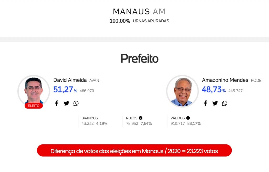 David venceu a eleição em 2020 com uma diferença de 23.223 votos em um universo de 910.717 votos válidos, contra Amazonino Mendes, ex-governador do Amazonas, falecido em 2023. À época, as pesquisas de intenção de voto apontavam a vitória de Amazonino, que era adversário político de Wilson Lima.