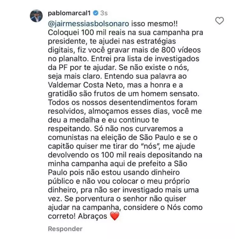 Em seguida, Marçal reagiu: “Isso mesmo! Coloquei 100 mil reais na sua campanha pra presidente, te ajudei nas estratégias digitais, fiz você gravar mais de 800 vídeos no planalto. Entrei pra lista de investigados da PF por te ajudar. Se não existe o nós, seja mais claro. Entendo sua palavra ao Valdemar Costa Neto, mas a honra e a gratidão são frutos de um homem sensato. Todos os nossos desentendimentos foram resolvidos, almoçamos esses dias, você me deu a medalha e eu continuo te respeitando“, concluiu o coach.