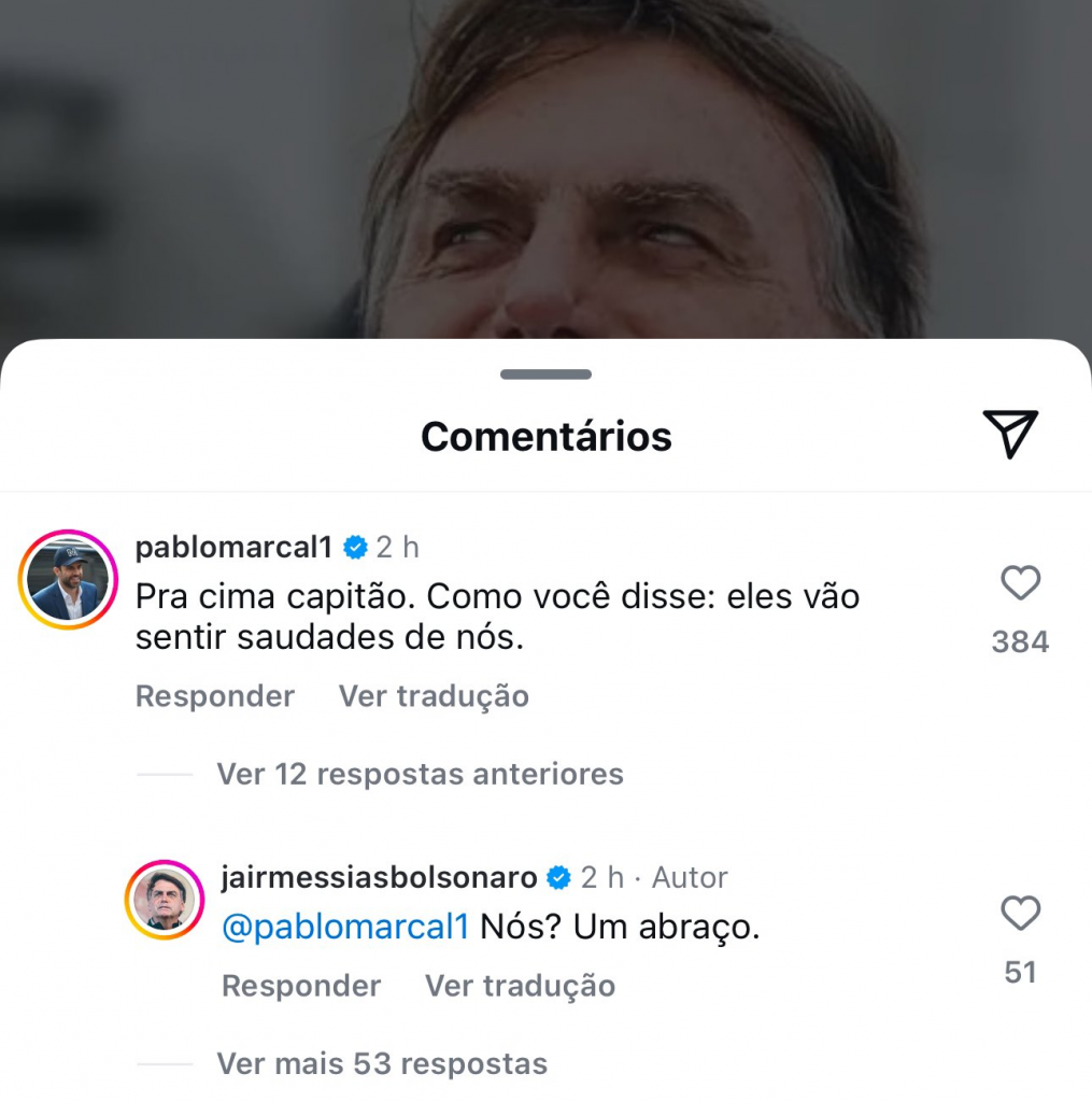 O candidato à prefeitura de São Paulo protagonizou uma troca de farpas com o ex-presidente Jair Bolsonaro nas redes sociais em agosto deste ano. Marçal comentou uma postagem de Bolsonaro no Instagram, na qual o ex-presidente destacava realizações de seu governo relacionadas às ferrovias. “Pra cima, capitão. Como você disse: eles vão sentir saudade de nós”, escreveu Marçal. Em resposta, o perfil oficial de Bolsonaro ironizou: “Nós? Um abraço”.