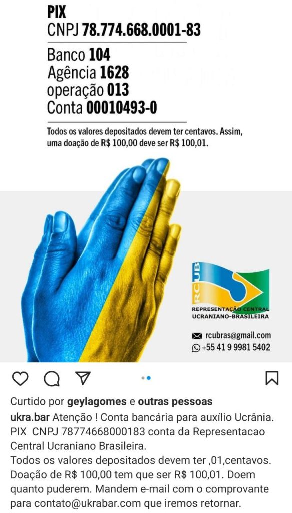 De acordo com a estudante, no Brasil também há pontos de auxílio destinados aos refugiados como Ukra Bar, bar ucraniano localizado em Curitiba. O estabelecimento realiza uma ação, em nome da Representação Central Ucraniana, para arrecadar valores transferidos para a Ucrânia.