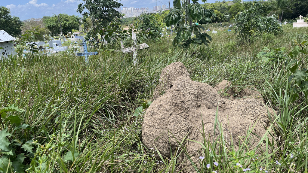 Na área destinada às vítimas da pandemia em Manaus, indicada por uma placa que informa “Aqui repousam as vítimas da Covid-19 – 1° onda“, os túmulos estão cobertos por vegetação, impossibilitando o acesso e até a identificação do jazigo.
