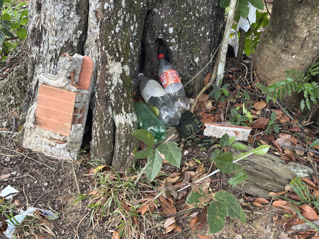 No mesmo local, em uma área de difícil acesso, entre árvores e próximo a um túmulo cercado, acumulam-se entulhos, garrafas plásticas e lixo.