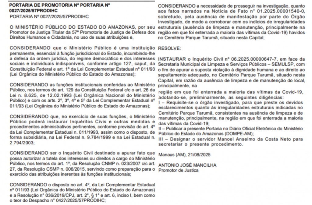 Cinco anos depois, em 21 de agosto de 2025, o MP-AM formalizou uma investigação para apurar se a Semulsp, que tem como gestor Sabá Reis, viola a dignidade humana e o direito ao sepultamento adequado. A Notícia de Fato 06.2025.00000647-7, assinada pelo promotor de Justiça Antônio José Mancilha, da 57ª Promotoria de Justiça de Defesa dos Direitos Humanos e Cidadania, aponta a falta de limpeza e manutenção do cemitério, sobretudo na área onde está a maioria das vítimas da doença infecciosa causada pelo coronavírus SARS-CoV-2.