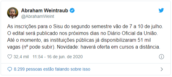 As inscrições para o sistema de seleção unificada (SISU) do segundo semestre de 2020, previstas para acontecer nos dias 16 e 19 de junho foram prorrogadas para os dias 7 e 10 de julho. O anúncio foi feito pelo ministro da Educação, Abraham Weintraub, no Twitter.