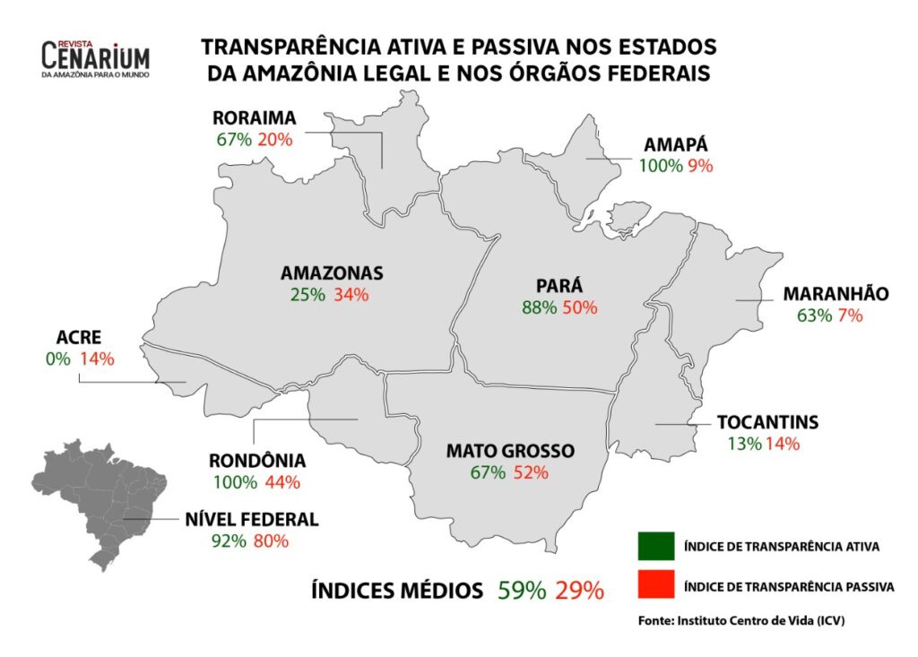 Referente aos órgãos federais que disponibilizam informações ambientais, a transparência ativa e passiva têm índice médio de 92% e 80%, respectivamente. Já Acre, Tocantins e Amazonas possuem os menores índices de transparência passiva – que corresponde ao percentual de pedidos de informações atendidos dentro do prazo estabelecido por lei, em relação aos pedidos de informação protocolados – e abaixo da média nacional, em contraponto ao Amapá, Rondônia e Pará, os líderes de transparência.