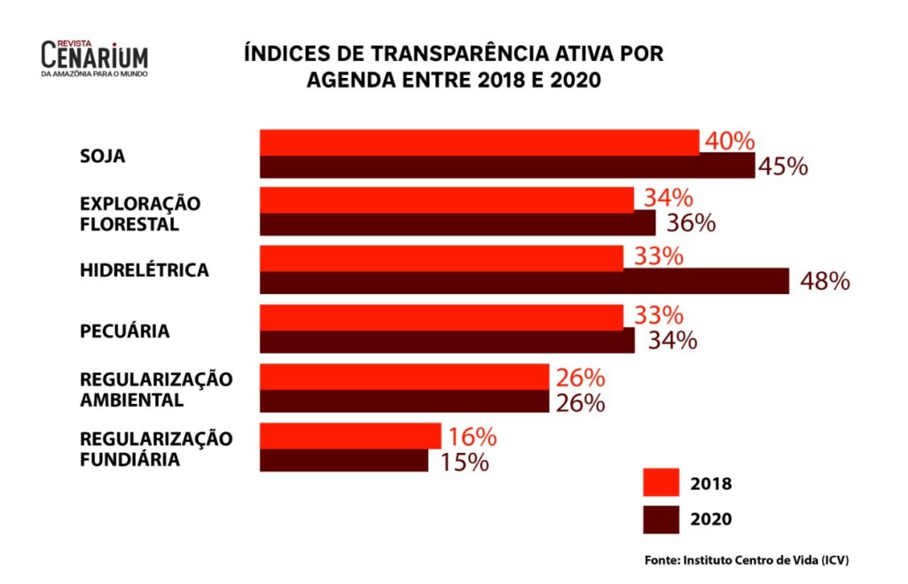 O estudo do Instituto Centro de Vida (ICV) indicou ainda a transparência ativa por agenda de uso dos recursos naturais. Foi verificado que o índice médio máximo é 48% referente às atividades de licenciamento de hidrelétricas. “Com menos da metade de dados e documentos relevantes disponíveis, o resultado ainda é insuficiente para auxiliar no monitoramento e no controle social de grandes obras”, indicou a pesquisa.