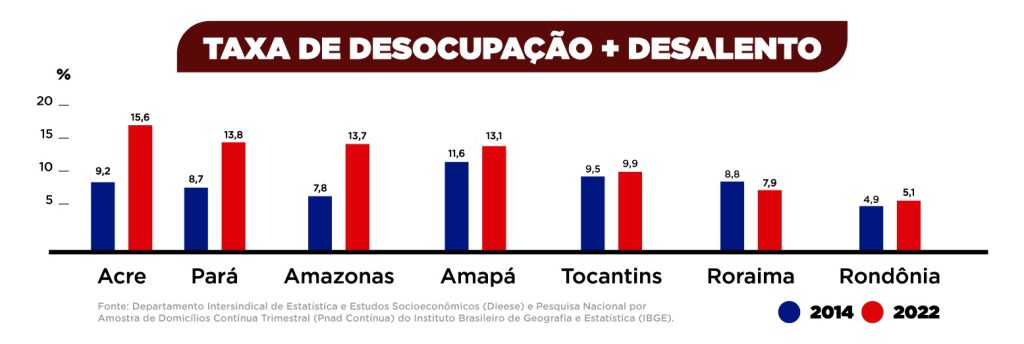 O levantamento do Dieese comparou dados do terceiro trimestre de 2022 com os do mesmo período de 2014. O Acre teve o maior aumento do desemprego entre os Estados do Norte do País (Acre, Amazonas, Amapá, Tocantins, Pará e Roraima e Rondônia). Já Roraima, foi o único que teve redução no período pesquisado: em 2014, era 8,8% e, em 2022, 7,9%.