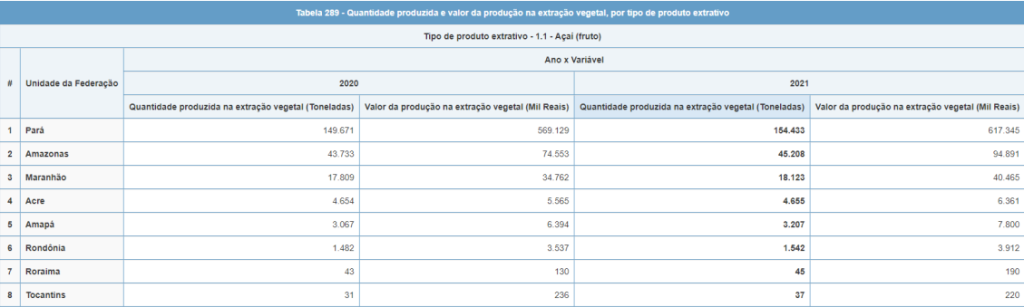 O Amazonas aparece como o segundo maior produtor de açaí, com 45.208 toneladas produzidas e valor de produção de R$ 94,9 milhões. A maior produção extrativista de açaí entre as Unidades da Federação é a do Pará, com 154.433 toneladas, e valor de produção de R$ 617,3 milhões. O total produzido pelo Pará equivale a 68,0% da produção nacional.