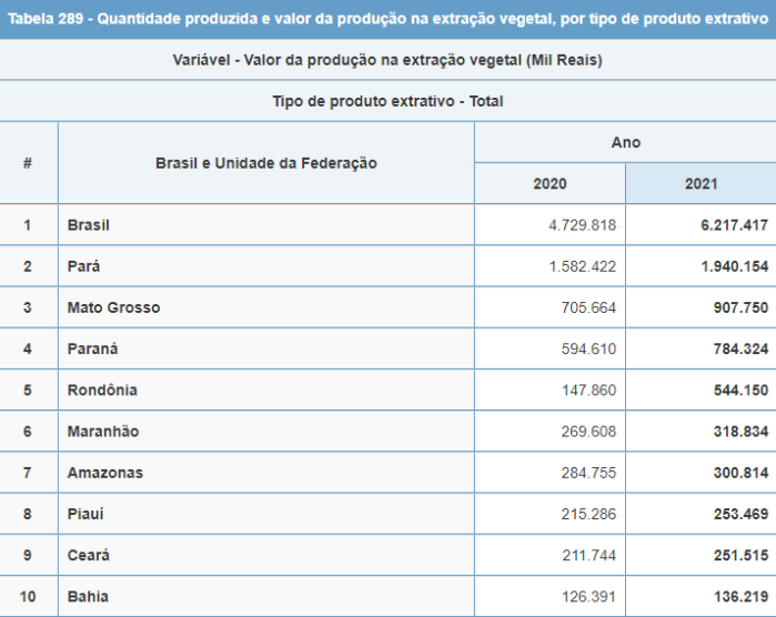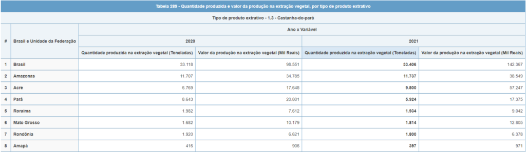 de produção de R$ 38,5 milhões no ano. A produção de castanha-do-pará se manteve estável, em 2021, frente a 2020, mas o valor de produção do produto cresceu 10,8%. Em comparação com outras Unidades Federativas (UF), o Amazonas aparece como a 6ª unidade federativa com maior valor de produção de extração vegetal.