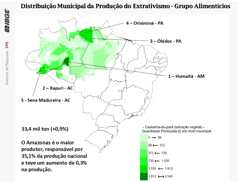 Humaitá lidera a produção nacional de castanha-do-pará, com 4,5 mil toneladas, Boca do Acre, com 895 toneladas, e Codajás, com 730 toneladas, que são, respectivamente, o segundo e terceiro municípios com maiores quantidades produzidas.