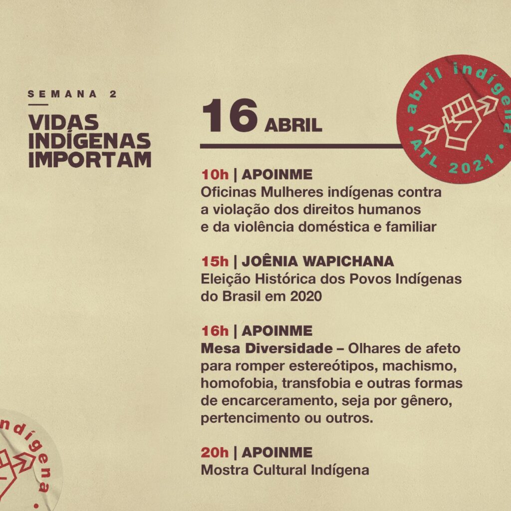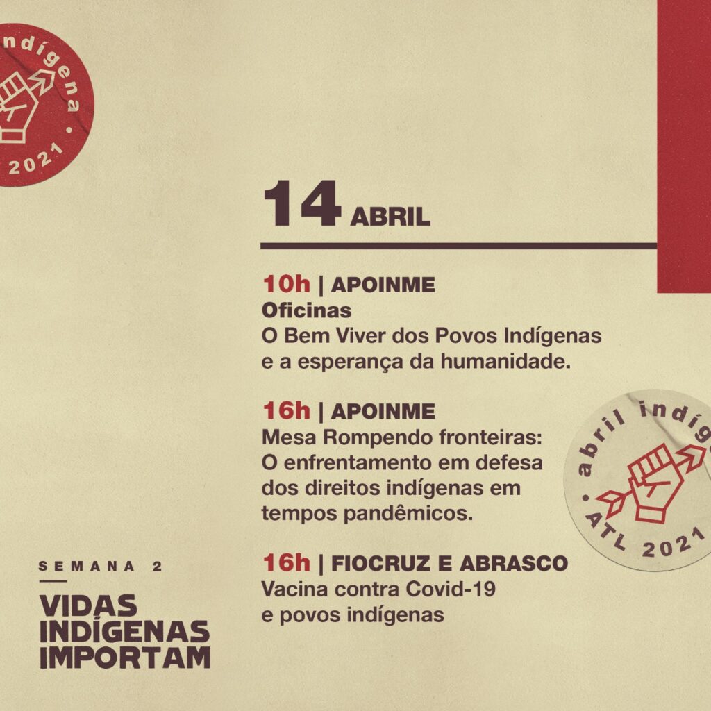 MANAUS – Nesta semana, entre os dias 12 e 18 de abril, a Articulação dos Povos Indígenas do Brasil (Apib) realiza a Semana 2 – Vidas Indígenas Importam da 17ª edição do Acampamento Terra Livre (ATL2021), programação que faz parte do Abril Indígena e vai até o dia 30 de abril. Com o tema ‘A nossa luta ainda é pela vida. Não é apenas um vírus!, a iniciativa busca discutir propostas, buscar soluções e cobrar ações em favor dos povos indígenas.