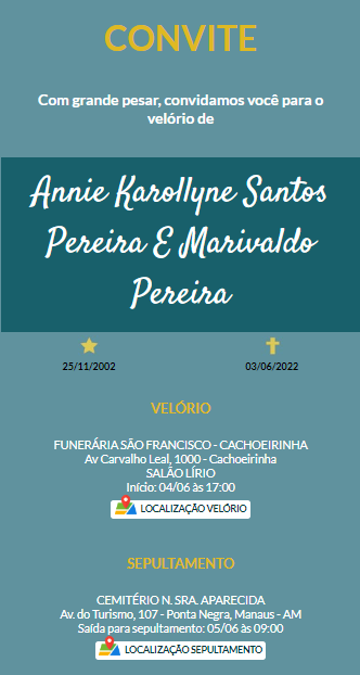 O velório começou na tarde deste sábado, 4, na Funerária São Francisco, bairro Cachoeirinha e o sepultamento está marcado para a manhã deste domingo, 5, às 9h, no Cemitério Nossa Senhora Aparecida, bairro Ponta Negra, Zona Oeste da capital.