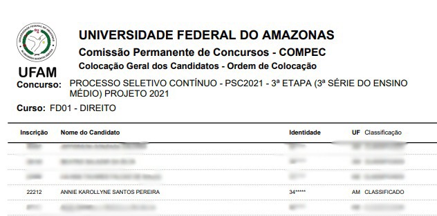 A jovem de 19 anos foi aprovada no Processo Seletivo Contínuo (PSC), da Universidade Federal do Amazonas, em 2021, e cursava o primeiro ano da faculdade de Direito.