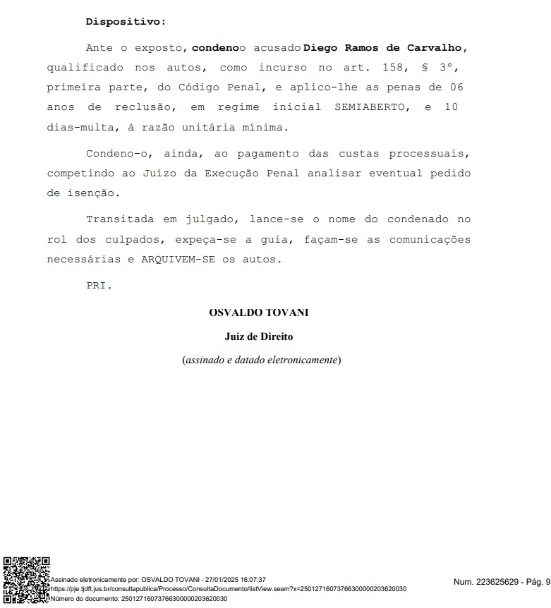 “Ante o exposto, condeno o acusado Diego Ramos de Carvalho, qualificado nos autos, como incurso no art. 158, § 3º, primeira parte, do Código Penal, e aplico-lhe as penas de 06 anos de reclusão, em regime inicial SEMIABERTO, e 10 dias-multa, à razão unitária mínima. Condeno-o, ainda, ao pagamento das custas processuais, competindo ao Juízo da Execução Penal analisar eventual pedido de isenção”, diz o juiz na sentença.