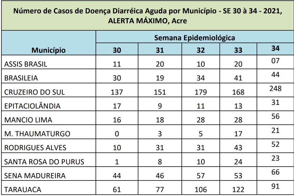 No Acre, as cidades Manoel Urbano, Porto Acre, bem como Porto Walter e Senador Guiomard estão com alerta mínimo, mas também já entraram no radar da secretaria da Saúde. Ao contrário desses municípios, a cidade de Tarauacá apresenta 457 casos da doença entre os dias 25 de julho a 30 de agosto, além de possuir alerta máximo.