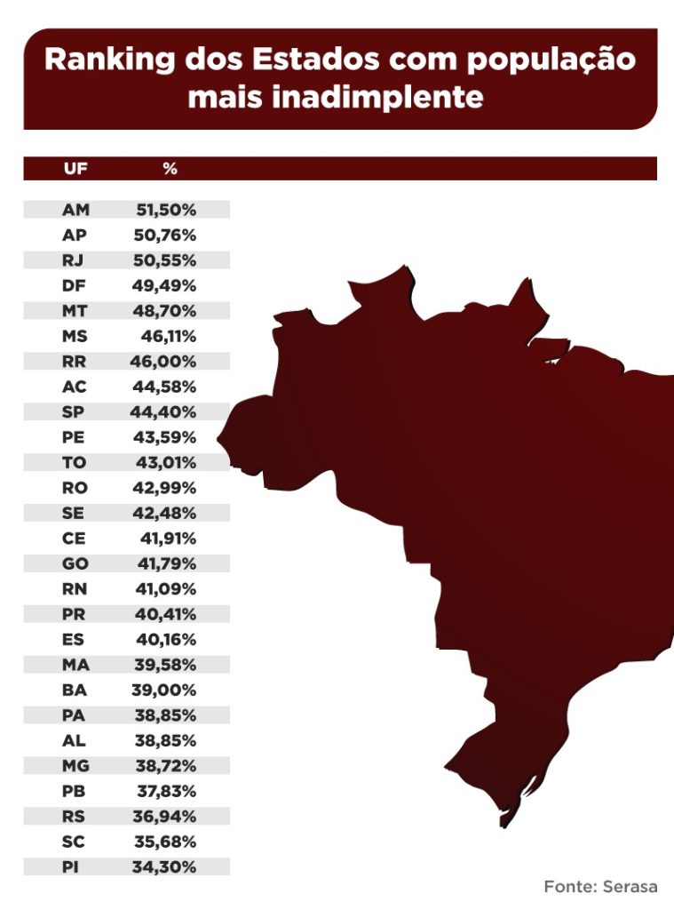 MANAUS – O Acre ocupou a 8ª posição no ranking dos Estados com população mais inadimplente do Brasil, com 44,58% dos habitantes com alguma dívida em aberto em setembro, de acordo com o Serasa. Eram, pelo menos, 400 mil consumidores devedores na Unidade Federativa. A inadimplência significa o não pagamento de uma conta ou dívida e os dados são do último levantamento do órgão, realizado em setembro deste ano.