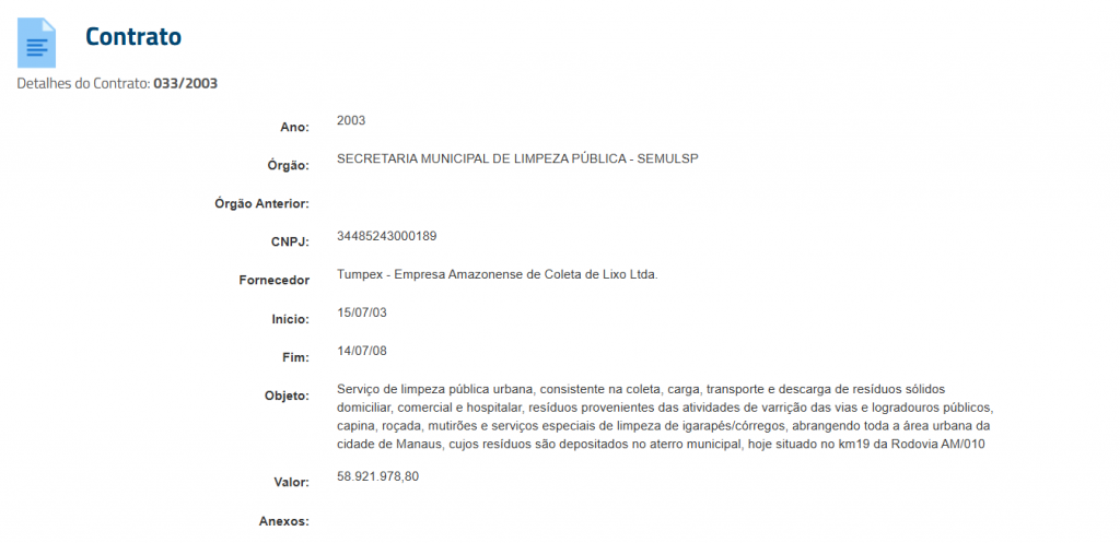 Para os serviços de coleta de lixo em Manaus, a prefeitura, por meio da Semulsp, possui contratos bilionários com duas empresas: a Tumpex e a Marquise. O primeiro é no valor de 1,8 bilhão, enquanto o segundo é de R$ 1,2 bilhão. Ambos se encerrariam em 2020, mas foram prorrogados até 2035.