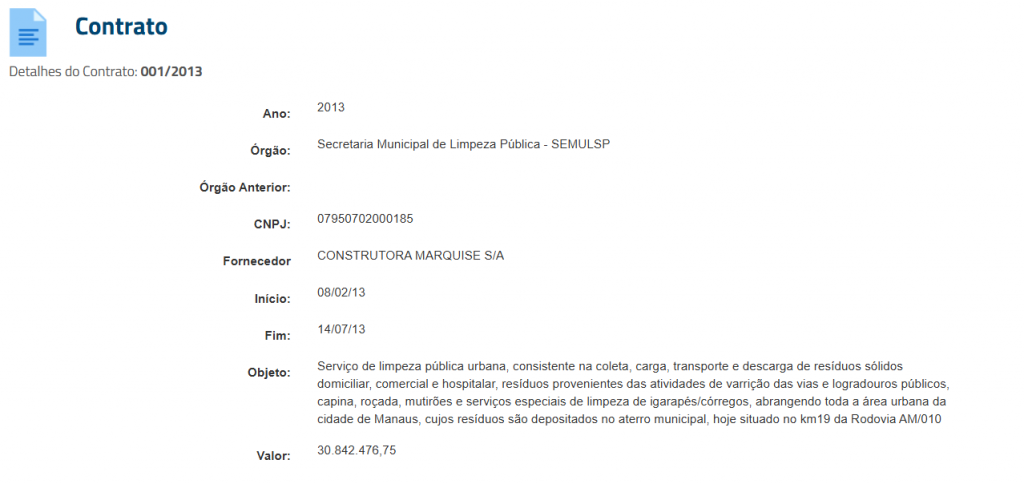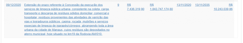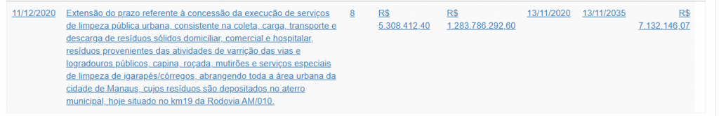 O contrato tem por finalidade a execução de “serviço de limpeza pública urbana, consistente na coleta, carga, transporte e descarga de resíduos sólidos domiciliar, comercial e hospitalar, resíduos provenientes das atividades de varrição das vias e logradouros públicos, capina, roçada, mutirões e serviços especiais de limpeza de igarapés/córregos, abrangendo toda a área urbana da cidade de Manaus, cujos resíduos são depositados no aterro municipal, hoje situado no km 19 da Rodovia AM/010“.
