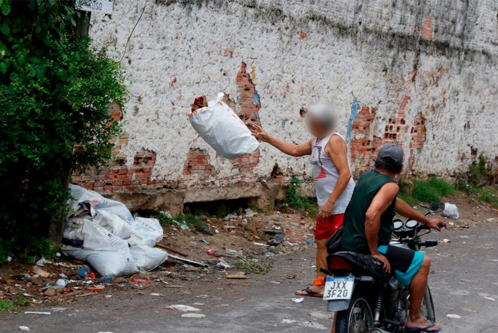 Nesta via, o cenário é de uma lixeira a céu aberto, com plásticos, marmitas de isopor e outros resíduos espalhados. Em cerca de uma hora em que a reportagem esteve no local, foi possível presenciar coletores retirando o lixo com um caminhão. Minutos depois, dois moradores da região despejaram os resíduos na rua. Para um deles, jogar os rejeitos no local é a única opção, já que o caminhão de coleta não consegue transitar em sua rua estreita.