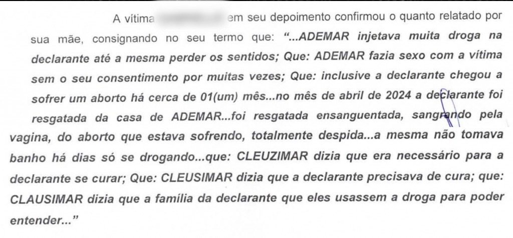 A ex-companheira de Ademar afirmou, em depoimento à polícia, que era forçada pelo ex-noivo a fazer uso de drogas na casa da sua família e que, enquanto estava sob efeito de drogas, Ademar estuprava a jovem enquanto ela estava inconsciente. A vítima chegou a sofrer um aborto pelas circunstâncias que se encontrava.