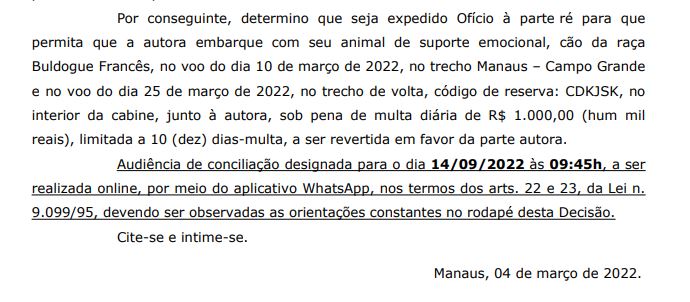 A decisão autorizando o embarque do animal na cabine do avião foi proferida pela juíza Cláudia Monteiro Pereira Batista, da 13ª Vara do Juizado Especial Cível da Comarca de Manaus. “Verifico a probabilidade do direito alegado pela parte autora, bem como o perigo de dano decorrente do não embarque do animal de suporte emocional, estando, portanto, tal medida em conformidade com o disposto no art. 300 do CPC”, escreveu na decisão.