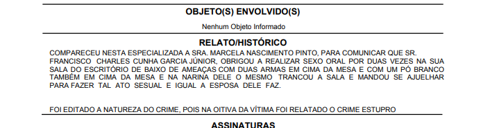“Ele escondia o meu celular, porque eu não podia gravar nada, não podia me defender. Nesse dia que eu subi [para i espaço onde Francisco Júnior estava], ele fez eu tocar nas genitálias dele“, diz em trecho de uma declaração. Abalada, Marcella descreveu novamente o que consta no BO registrado na PC-AM. Após ela começar a chorar, o suspeito teria pedido para que a então recepcionista lavasse o rosto no banheiro.