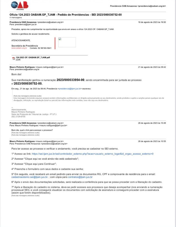 Na terça-feira, 7, o presidente da OAB-AM, Jean Cleuter Simões Mendonça, enviou um documento ao TJAM apontando as constantes instabilidades e períodos de indisponibilidade no Projudi e os prejuízos ao exercício profissional da advocacia com o risco de comprometimento a prazos processuais. A OAB-AM se dispôs a colaborar tecnicamente com a equipe de Tecnologia da Informação do TJAM para que o problema fosse solucionado.