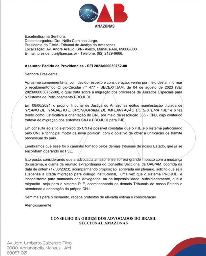 O Conselho Seccional da OAB/AM solicitou a suspensão da migração do sistema Projudi, em 2023, adotado pelo Tribunal de Justiça do Amazonas para viabilizar um diálogo institucional sobre o impacto da mudança na rotina da advocacia amazonense em ofício.