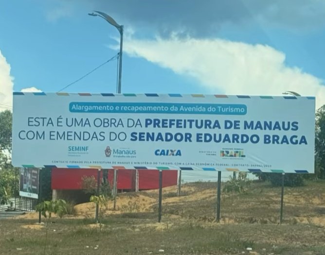 Outra sinalização é referente ao alargamento e recapeamento de um trecho da Avenida do Turismo, que abrange os bairros Ponta Negra e Tarumã, na Zona Oeste de Manaus. Na placa afixada, lê-se: “Esta é uma obra da Prefeitura de Manaus com emendas do senador Eduardo Braga. Contrato firmado pela Prefeitura de Manaus e Ministério do Turismo, com Caixa Econômica Federal”.