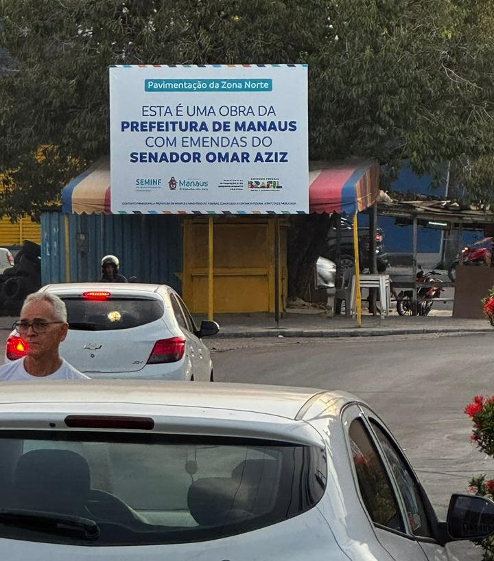 Uma das placas está localizada na Rua Hélio Leão, bairro Cidade Nova, Zona Norte da capital, referindo-se à pavimentação da via. “Esta é uma obra da Prefeitura de Manaus, com emendas do senador Omar Aziz“, consta na sinalização. A placa também leva os logotipos da prefeitura, Seminf e governo federal.
