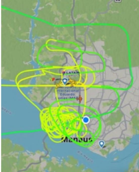 Imagens registradas em um aplicativo de aviação mostra que a aeronave fez várias voltas no ar antes de pousar no Aeroporto Internacional de Manaus. No registro, é possível notar outros aviões de companhias aéreas que precisaram desviar a rota por conta da atividade emergencial na pista do aeroporto.