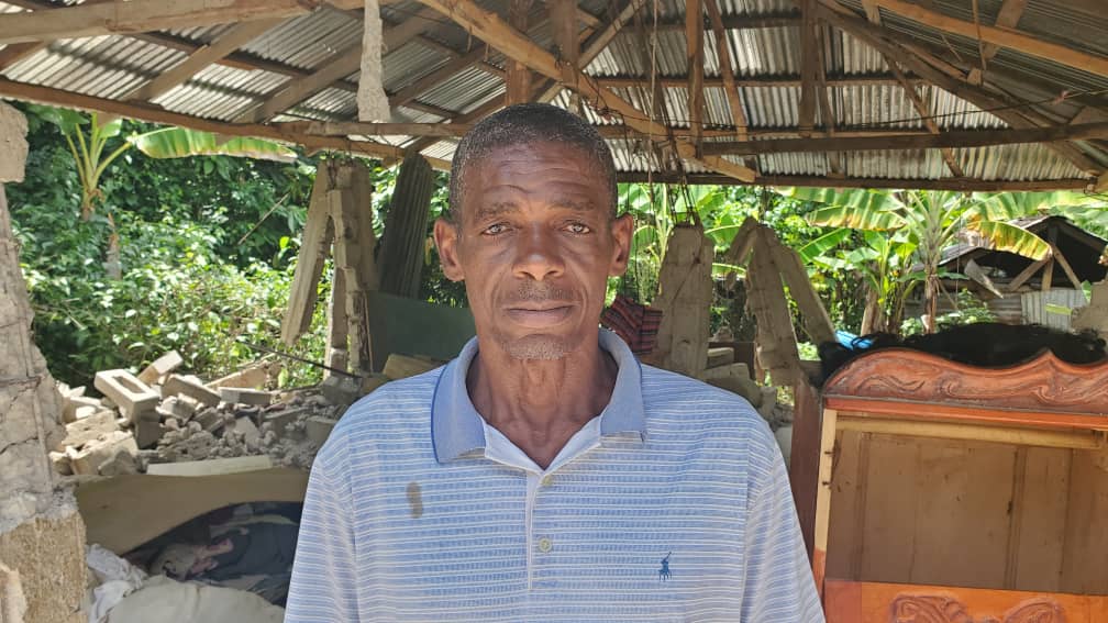 O agricultor Dumont Avenor é pai de seis filhos e reside com a esposa na comunidade de Camp-Perrin . Ele conta que, no momento do terremoto, trabalhava do lado de fora da casa quando ouviu um som muito forte. “Minha esposa havia saído com dois de meus filhos. Quando as outras crianças ouviram o barulho, eu lhes disse que era um terremoto e que precisavam se juntar a mim no pátio”, relembra, atônito.