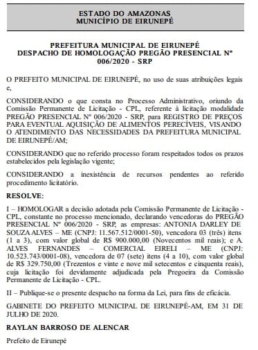 Por meio do Pregão Presencial nº 006/2020, Barroso contratou duas empresas para aquisição de alimentos perecíveis, visando o atendimento das necessidades da prefeitura localizada a 1.159 quilômetros da capital amazonense. As contratadas são as empresa Antonia Darley de Souza – ME, de nome fantasia Comercial Maia, por R$ 900 mil e a A. Alves Fernandes – Comercial Eireli – ME, de nome fantasia Mercearia Fernandes, por R$ 329 mil.