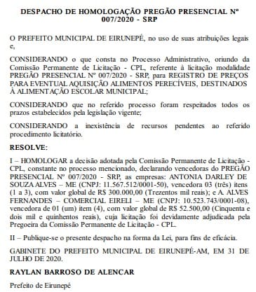 No Pregão Presencial nº 007/2020, também para aquisição alimentos perecíveis, desta vez destinados à alimentação escolar, o prefeito contratou outras duas empresas: a Antonia Darley de Souza Alves – ME, por R$ 300 mil, e a A. Alves Fernandes – Comercial Eireli – ME, por R$ 52 mil.