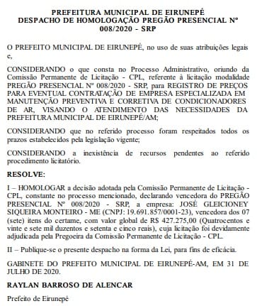 MANAUS – O prefeito de Eirunepé, Raylan Barroso (Pros), pretende gastar cerca de R$ 2 milhões para aquisição de alimentos perecíveis e na manutenção de condicionadores de ar. Os despachos dos contratos foram publicados nesta segunda-feira, 3, no Diário Oficial dos Municípios (Dom).