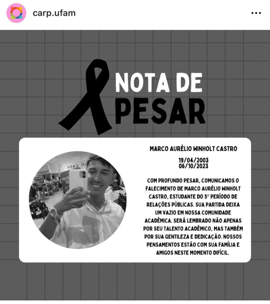 O Centro Acadêmico de Relações Públicas da Ufam também emitiu nota de pesar pela morte de Winholt e destacou que o estudante era conhecido por ser gentil e dedicado aos estudos. “Sua partida deixa um vazio em nossa comunidade acadêmica. Ele será lembrado não apenas por seu talento, mas também por sua gentileza e dedicação”, diz nota do centro acadêmico.