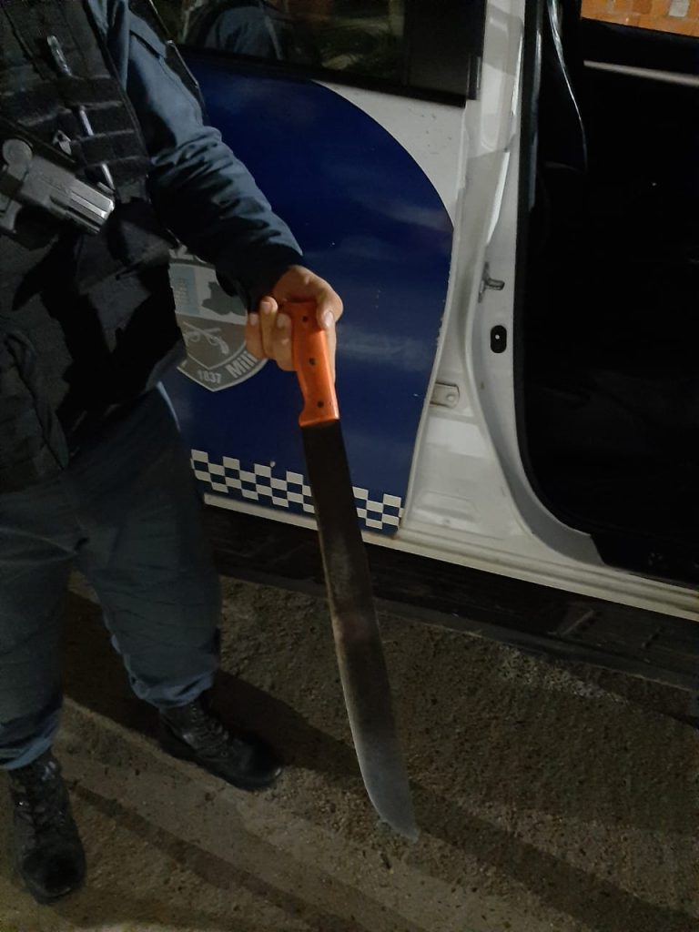 Menos de um minuto depois, uma viatura da Polícia Militar estaciona em frente ao colégio e aborda a dupla. A polícia encontra o facão com o homem durante revista.