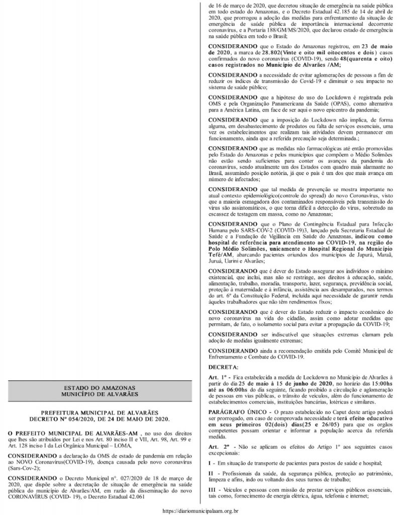 Em Alvarães, segundo o decreto Nº 054/2020, de 24 de maio de 2020, publicado no Diário Oficial dos Municípios (DOM) desta terça-feira, 26, o lockdown vai até o dia 25 de junho, passando a valer desde essa segunda-feira, 25, entre os horários de 15h até 6h da manhã seguinte.