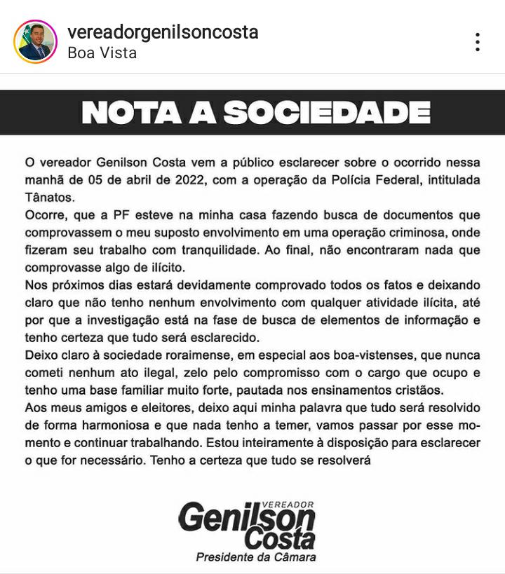 Em nota divulgada nas redes sociais, Genilson esclarece que a polícia esteve em sua casa fazendo buscas de documentos que comprovassem o suposto envolvimento na organização, mas não encontraram nada que justificasse o ilícito.